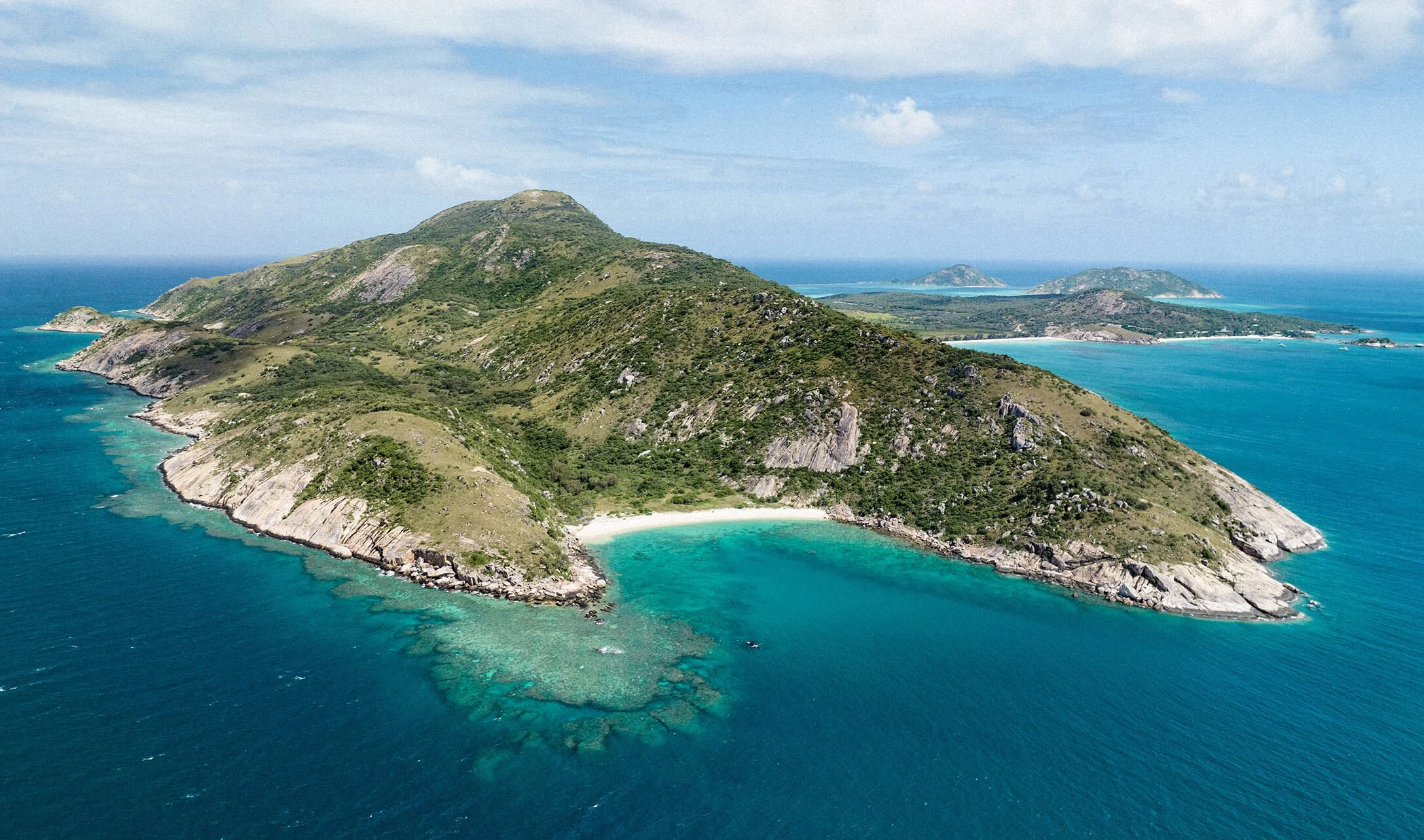 People often ask that question and I'm not really gonna give you a good answer because I love the whole lot. It's very beautiful everywhere under and up above the water. It's not a tiny island; it's seven square kilometers in size, big enough to have a mountain a thousand feet tall on it. It's not the quintessential tropical island – it doesn't look like somewhere in Tahiti or the Maldives where there's big palm trees looping over the lagoon. It's quite dramatic looking. It's made of very old granite, and it can be quite dry in the dry season, but the rocks are just beautiful and it's got a really stark beauty.
